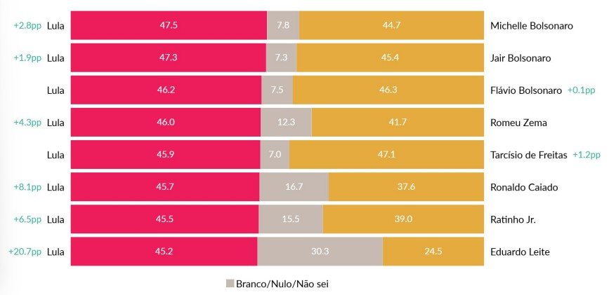 De acordo com o levantamento, o parlamentar teria 46,3% das intenções de voto, enquanto o atual chefe do Executivo aparece com 46,2%. A diferença de um décimo percentual está dentro da margem de erro de 1 ponto percentual, para mais ou para menos, caracterizando empate técnico. O percentual de eleitores que declararam “Não sei/Branco/Nulo” é de 7,5%.