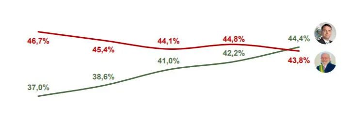 Já na simulação de segundo turno, Flávio Bolsonaro alcança 44,4% das intenções de voto, contra 43,8% de Luiz Inácio Lula da Silva, uma vantagem numérica de 0,6 ponto percentual. Em comparação com o levantamento anterior, realizado em janeiro, o atual presidente recuou 1 ponto, enquanto o senador avançou 2,2 pontos.